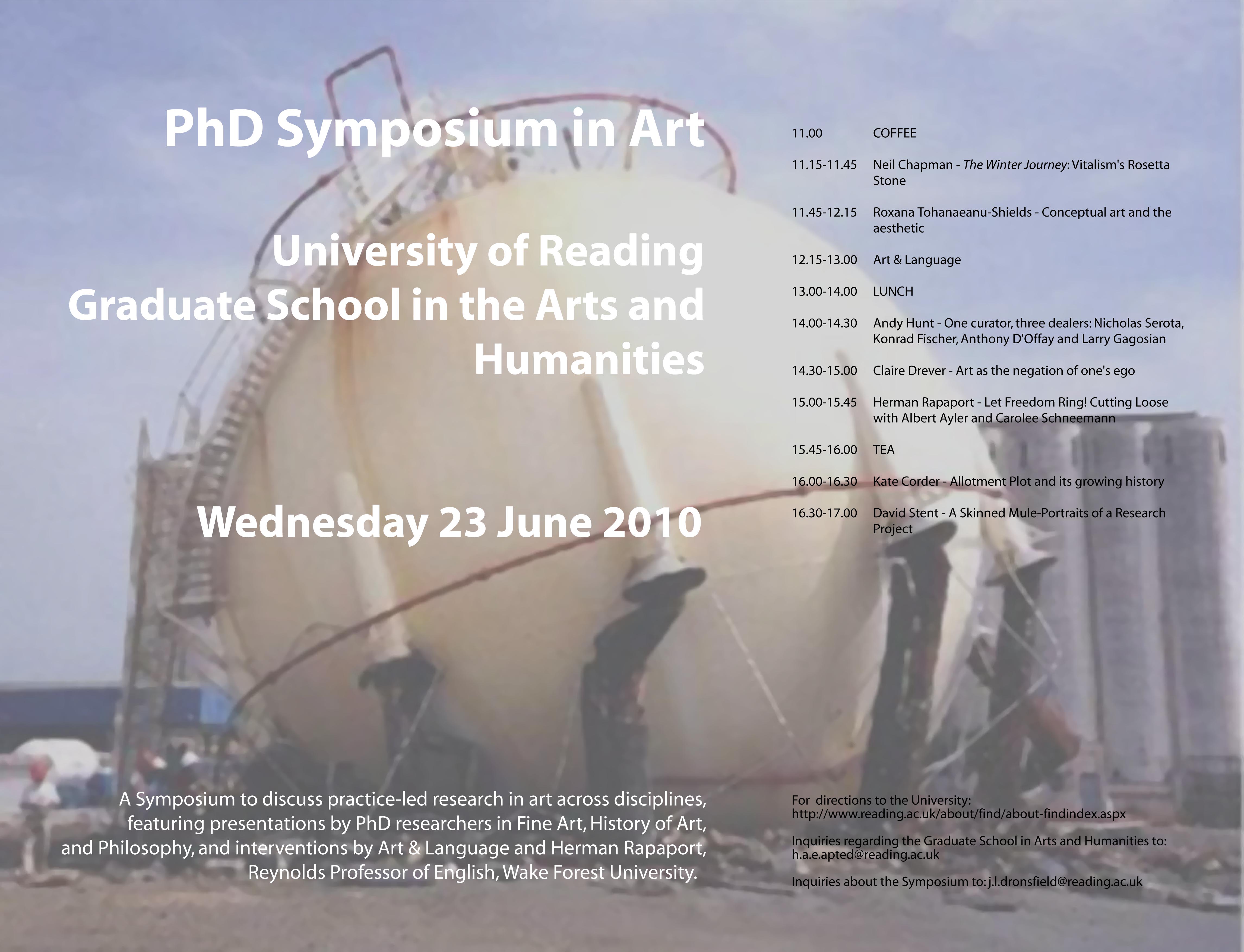 A Symposium to discuss practice-led research in art across disciplines at the University of Reading, featuring presentations by PhD researchers in Fine Art, History of Art, and Philosophy, and interventions by Art & Language and Herman Rapaport, Reynolds Professor of English, Wake Forest University.