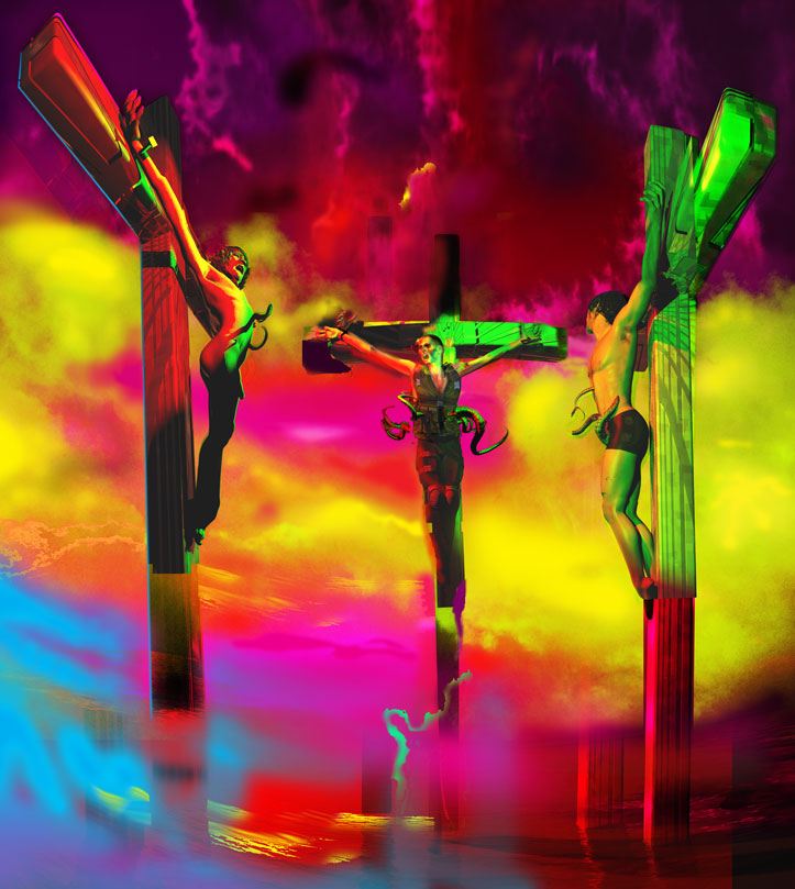 This is the representation of a crucifixion on an alien planet. Of a deep-space pilot who wakes to find herself nailed to a cross. The details of how this happened are unclear. She remembers she was lying on her bunk considering the nature of surplus value … now her ship is long gone … light years away. Two other people are crucified here but there is no audience. No witnesses of this enactment of a cliché … neither a sacrifice nor a prophesy.