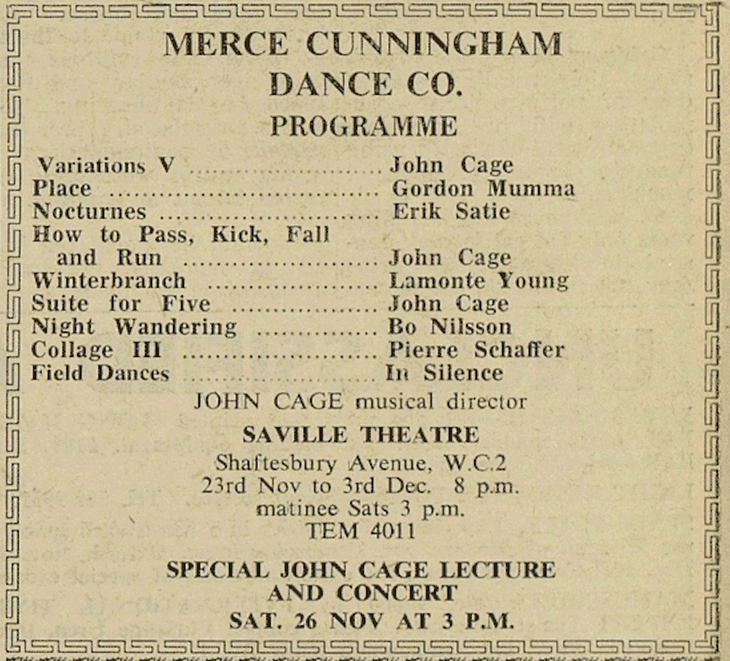 Some sense of it is given in a remarkable episode of Tempo, the ITV arts programme. Afterwards Bryars gave Cage a couple of his compositions for his ‘Notations’ project. The Cunningham residency, Bryars has written, ‘really opened my eyes. I decided that this kind of thing was what I wanted to spend the rest of my life doing’.