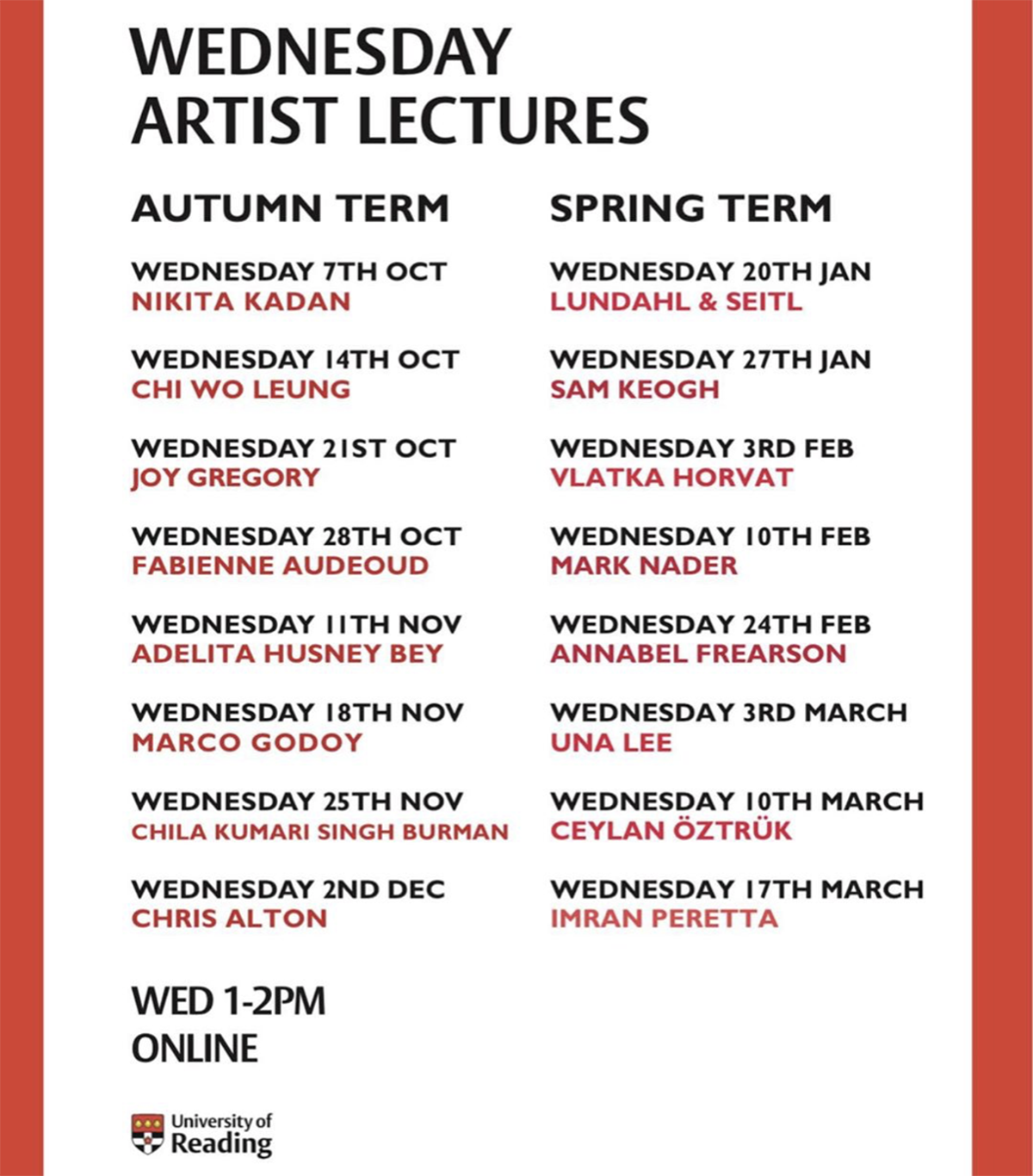 Our Wednesday Artist Lectures started on 7 October 2020. It’s a great lineup with international speakers joining us live from Kiev, Hong Kong, London, Paris, New York, Madrid, Stockholm and Zurich this autumn and spring.