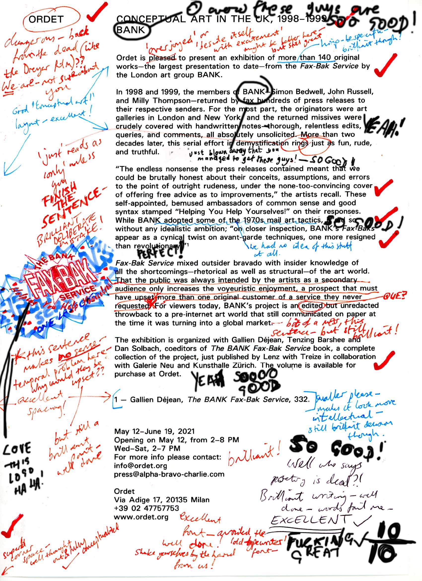 In 1998 and 1999, the members of BANK—Simon Bedwell, John Russell, and Milly Thompson—returned by fax hundreds of press releases to their respective senders. For the most part, the originators were art galleries in London and New York, and the returned missives were crudely covered with handwritten notes—thorough, relentless edits, queries, and comments, all absolutely unsolicited. More than two decades later, this serial effort in demystification rings just as fun, rude, and truthful.
