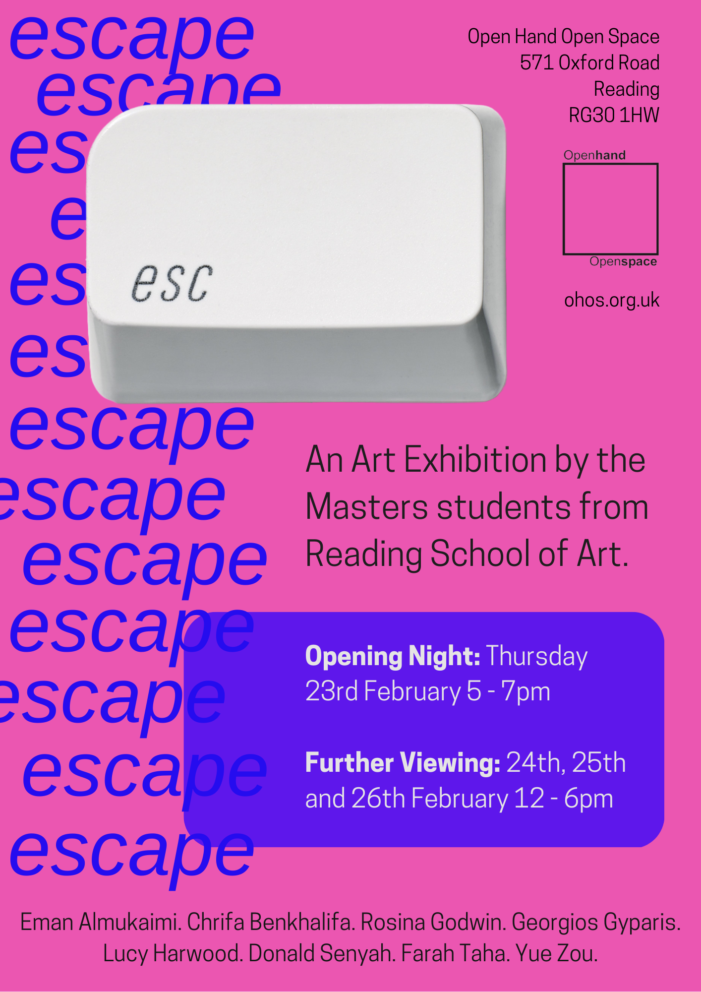 Escape from reality, escape from the institution, escape from yourself. This art exhibition is produced by the Fine Art Master’s students from Reading School of Art. The artists work in a wide variety of mediums, spanning painting, sculpture, text and film. Each artist takes inspiration from their personal experiences such as feelings of belonging, erasure, or uncertainty.