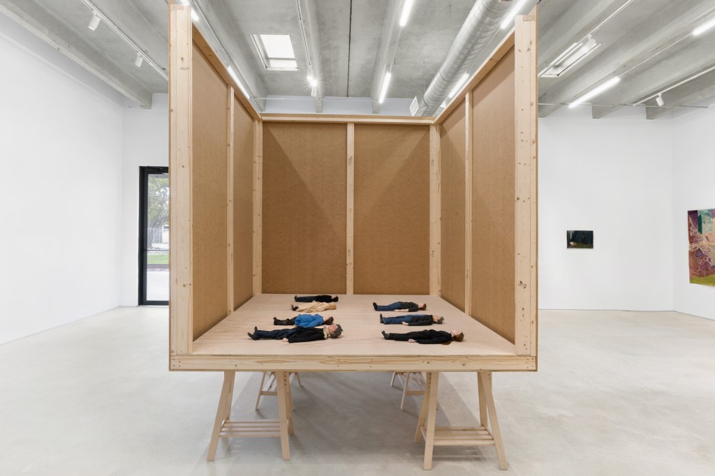 At the center of the exhibition is a two-screen video installation that re-enacts a recorded radio conversation between a Ukrainian writer and a German interviewer captured during the early stages of the full-scale invasion of Ukraine. Rather than dramatizing the exchange, the artists restage it using hand-crafted puppets, fragmented doubles that resemble the artists but also stand in for others caught in unequal or difficult dialogues. These figures perform to the original audio, inhabiting a space between self-portrait and symbolic surrogate. One screen plays the subtitled dialogue, while the other presents the filmed puppet performance in a sparse, studio-like setting. The result is a layered encounter between voice, image, and gesture that explores misalignment, fatigue, and the ethics of mediated discourse.